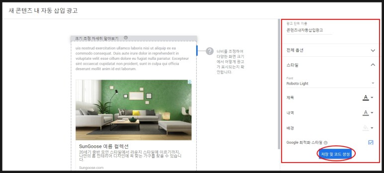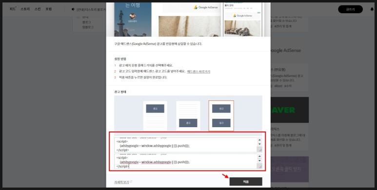 9. 광고 유형을 선택하고 복사한 광고 코드를 붙여 넣고 적용을 클릭합니다.
